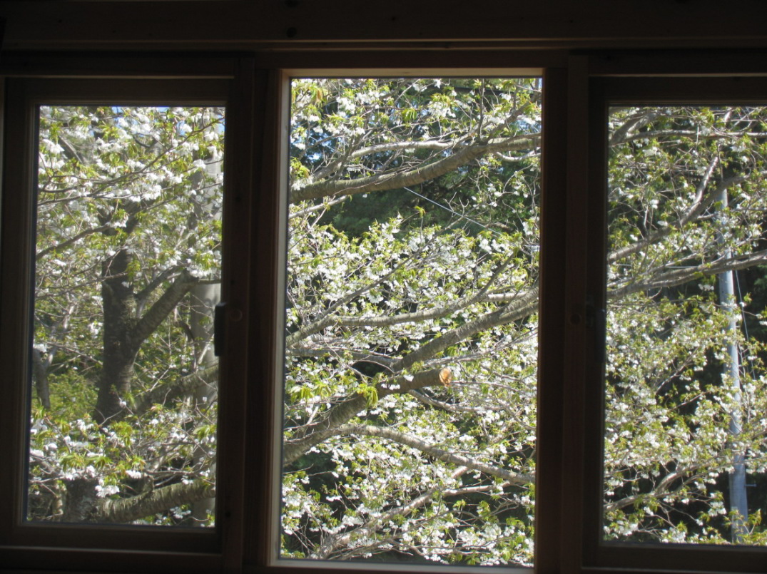 ロフトから見た玄関の桜です。この敷地には大きな3本の山桜があります。