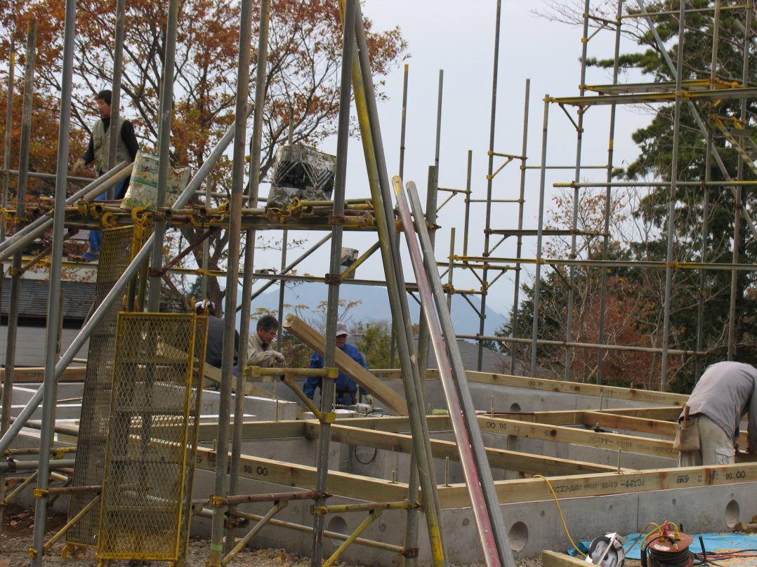 基礎のコンクリートの上に角の木(さて呼び名はなんていうのか?)を組んでいます。
