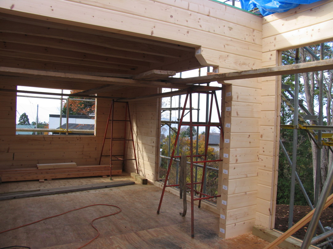これで明日から七日くらいで屋根の辺まで周りの枠のログが組みあがるそうです。