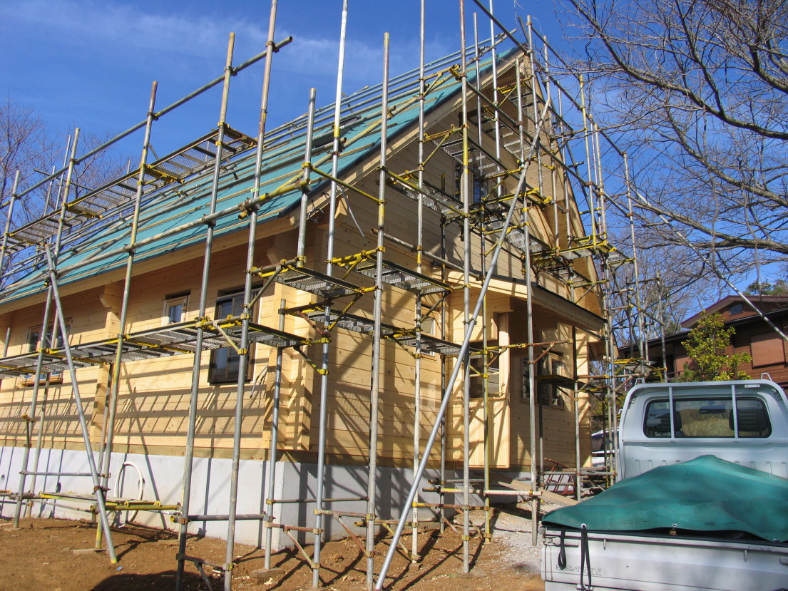 ログを組み立てる足場パイプを組んでます。